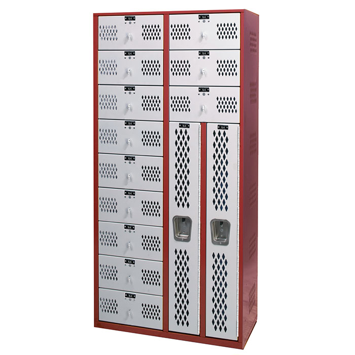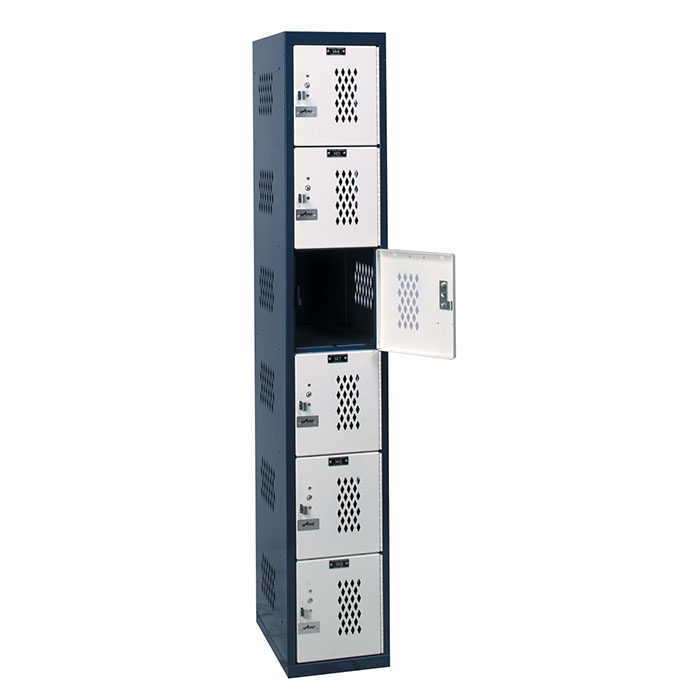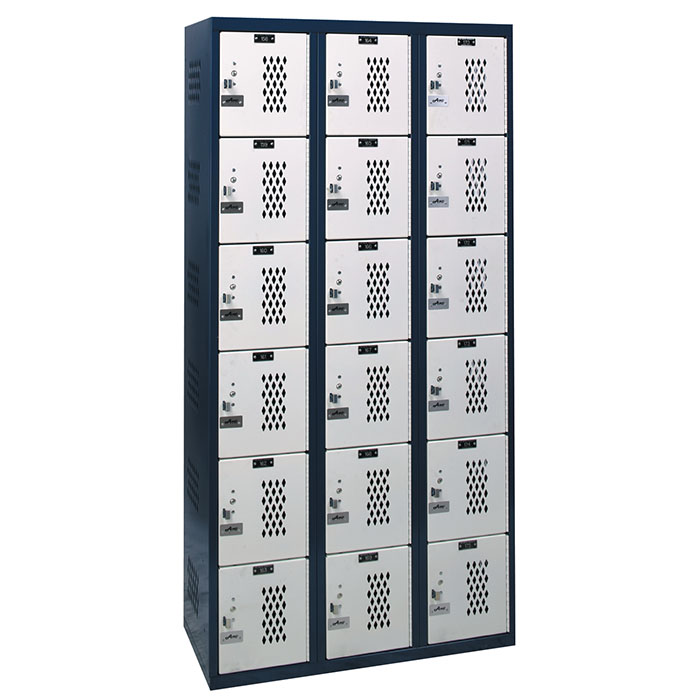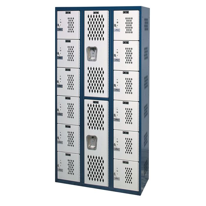 Athletic-type lockers use diamond perforated doors and sides to ensure proper ventilation.